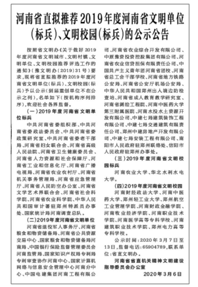 ?3月6日,河南省直機(jī)關(guān)精神文明建設(shè)指導(dǎo)委員會(huì)辦公室對(duì)擬推薦2019年度河南省文明單位(標(biāo)兵)、文明校園(標(biāo)兵)進(jìn)行公式公告,其中中原豫資投資控股集團(tuán)有限公司擬推薦為2019年度河南省文明單位。2019年,豫資控股集團(tuán)在河南省直文明辦、省財(cái)政廳文明辦的指導(dǎo)與幫助下,始…